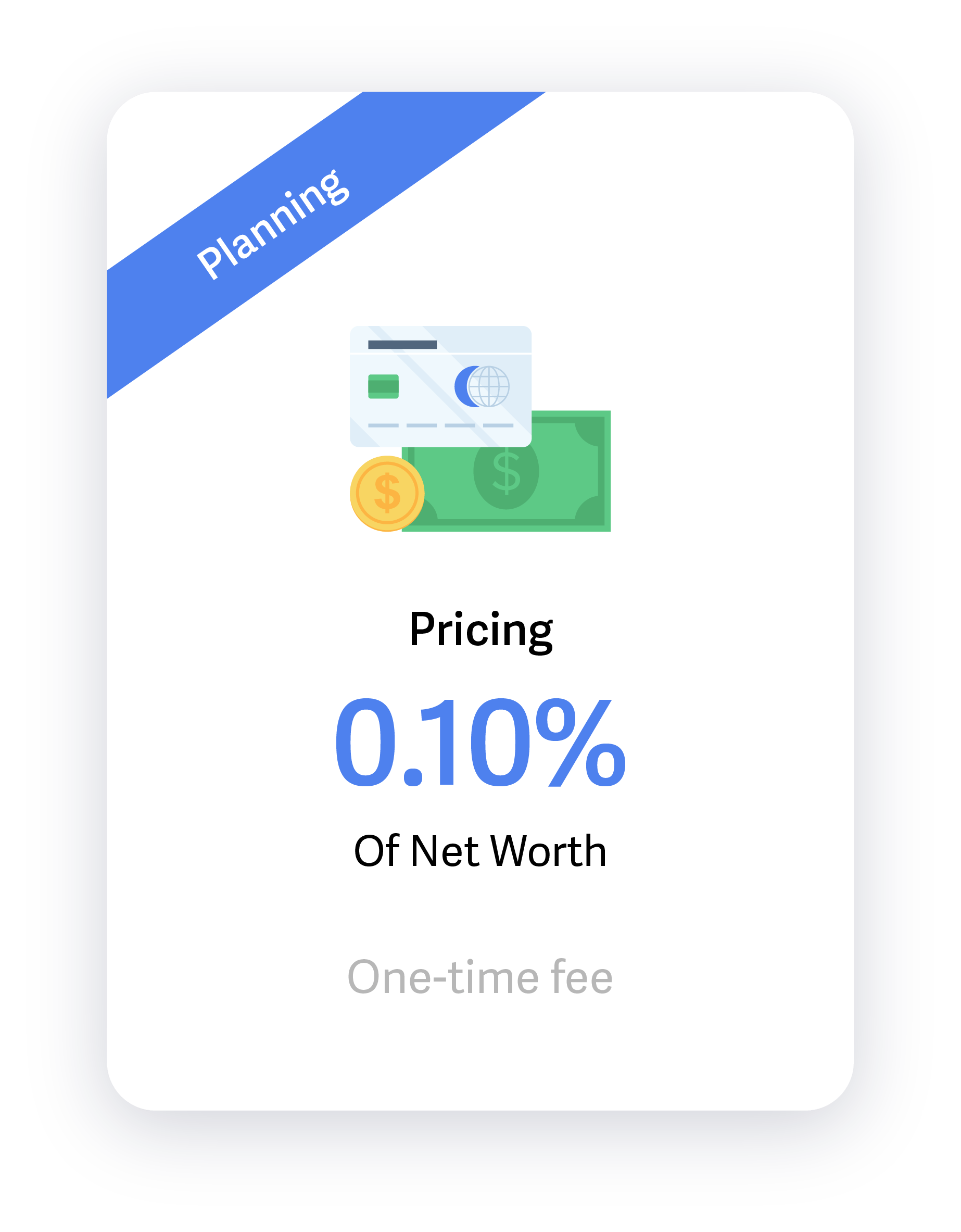 Financial planning summons a one-time fee based on the complexity of your situation. Your investment for this service is calculated at .10% of your net worth (e.g., if your net worth is $5 million, your cost is $5,000). Please note a minimum fee of $2,500 applies, and you’ll receive a 25% discount on subsequent plan updates to address any life-changing events.